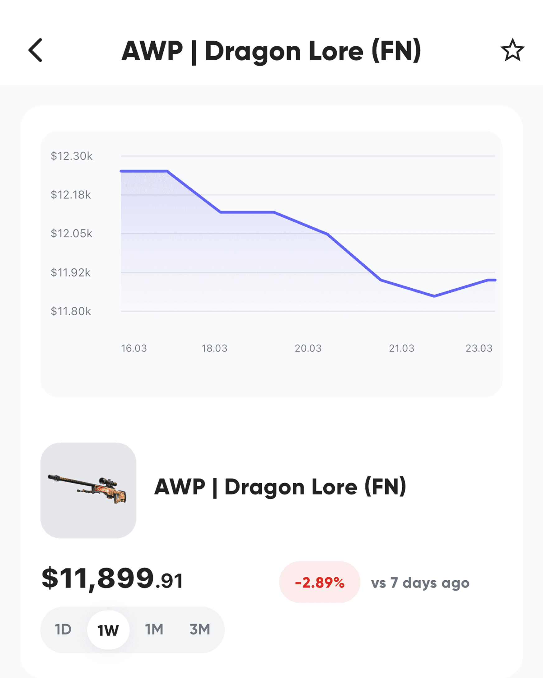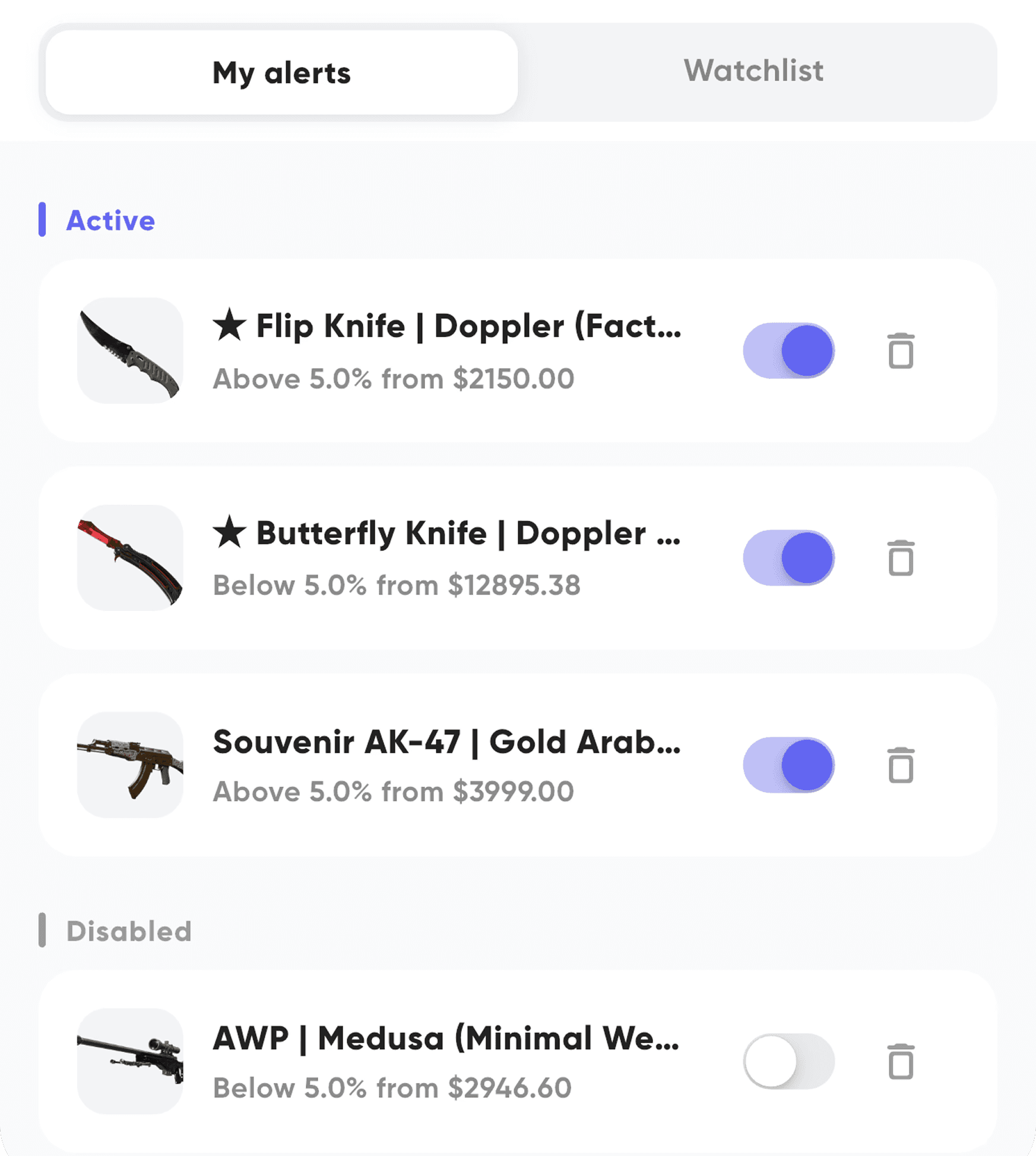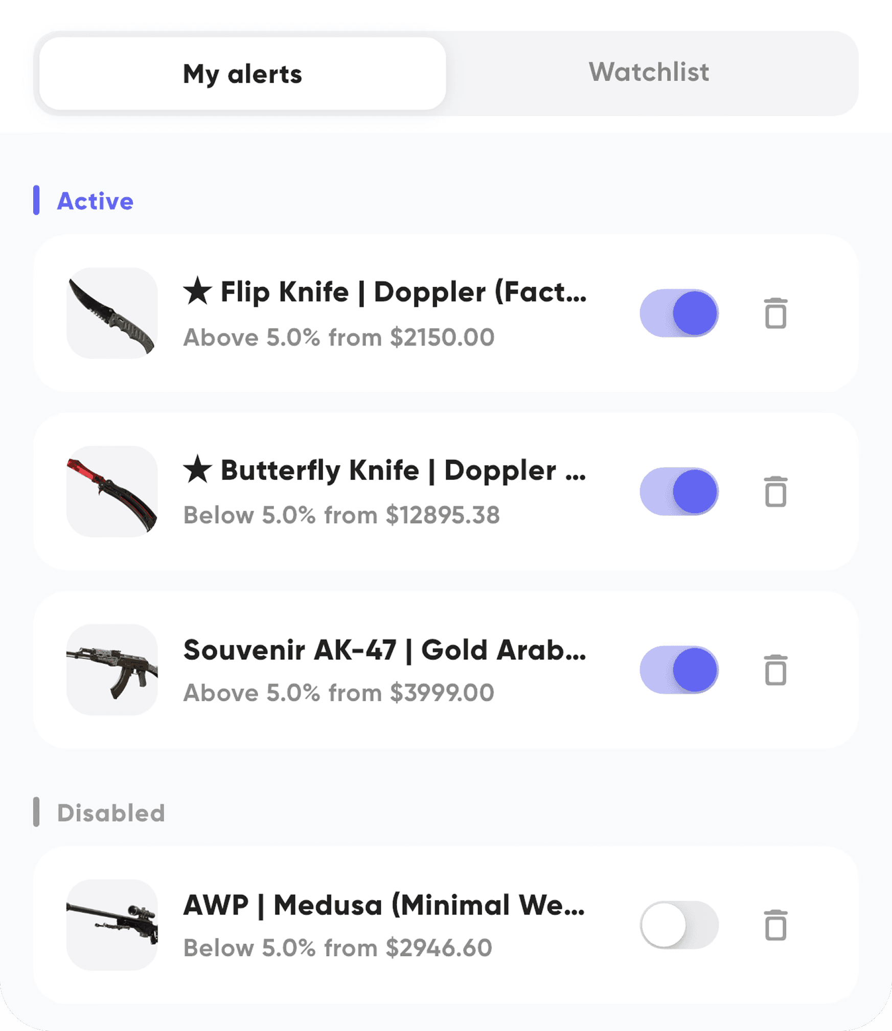 You set a target - either a specific price (e.g. “notify me when AK-47 Redline drops below $18”) or a percentage change. We check prices once per day and send a push notification when your condition is met.