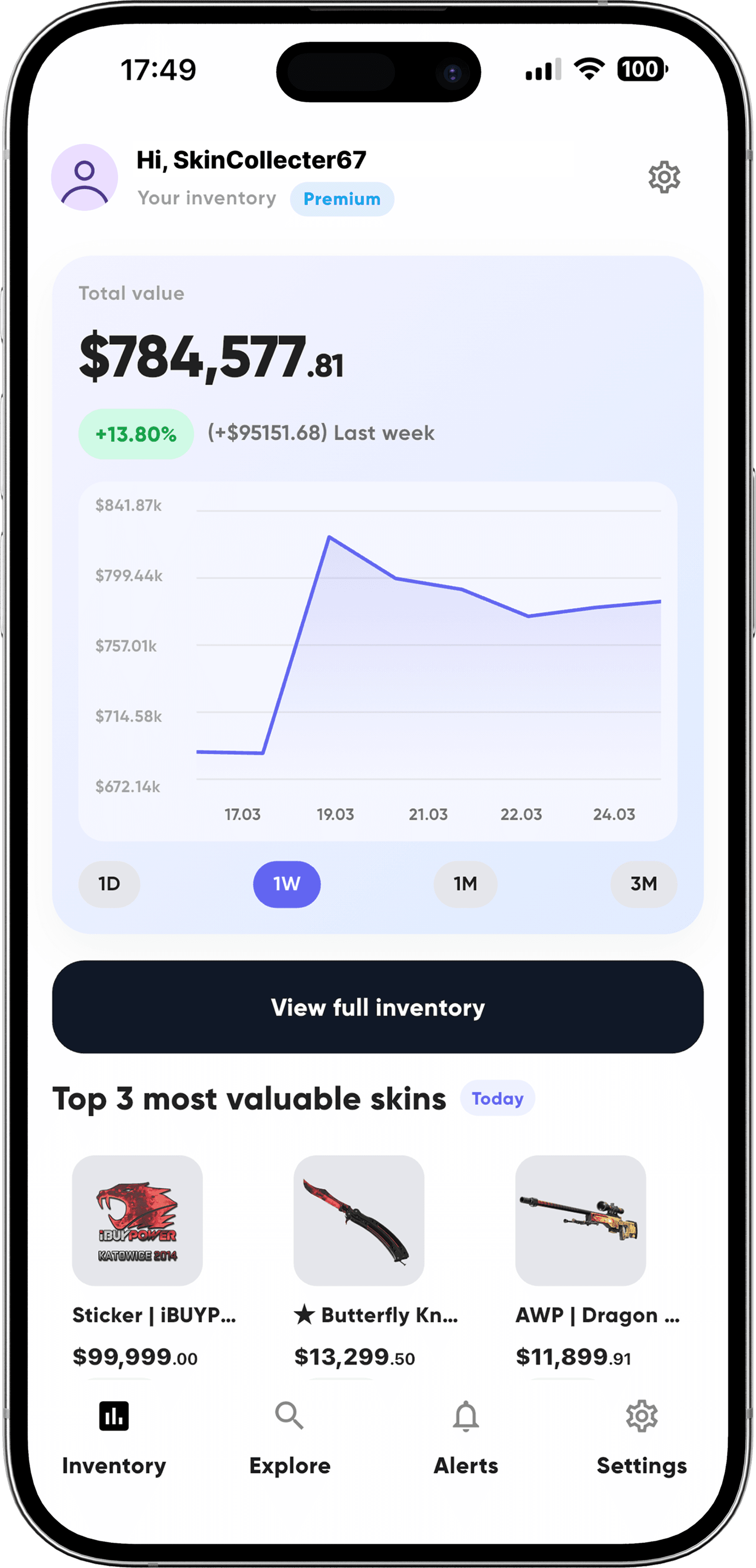 Free: 5 skins on watchlist, 3 active alerts, 7-day portfolio history. Premium ($3.99/month or $29.99/year): unlimited watchlist, 25 alerts, 30-day history, full price statistics (7/30/90 days), portfolio analytics (ROI, diversification), detailed skin data (float, pattern).