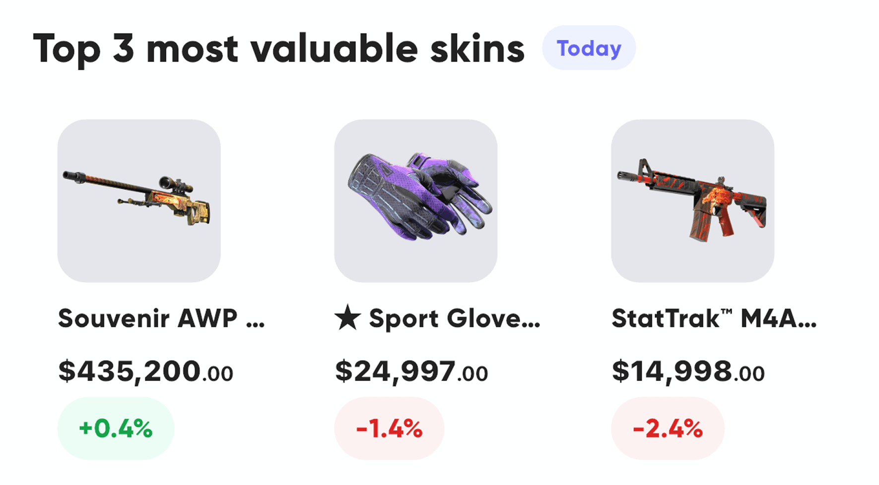 Prices are sourced from CSFloat - the largest peer-to-peer marketplace for CS2 skins. We take a daily snapshot of current prices for over 6,000 items. Prices reflect actual sales, not listings. Data is updated once per day.